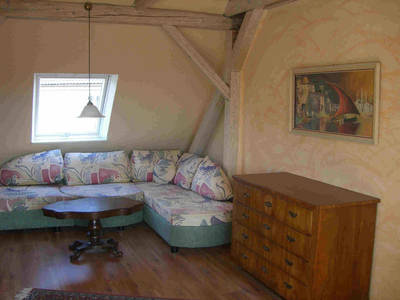 Sie erwartet ein großzügiges einzimmer Apartment im Dachgeschoss, für zwei Personen. Die Wohnecke kann zu einem zusätzlichen Doppelbett umgestaltet werden, um Platz für vier Personen zu schaffen.